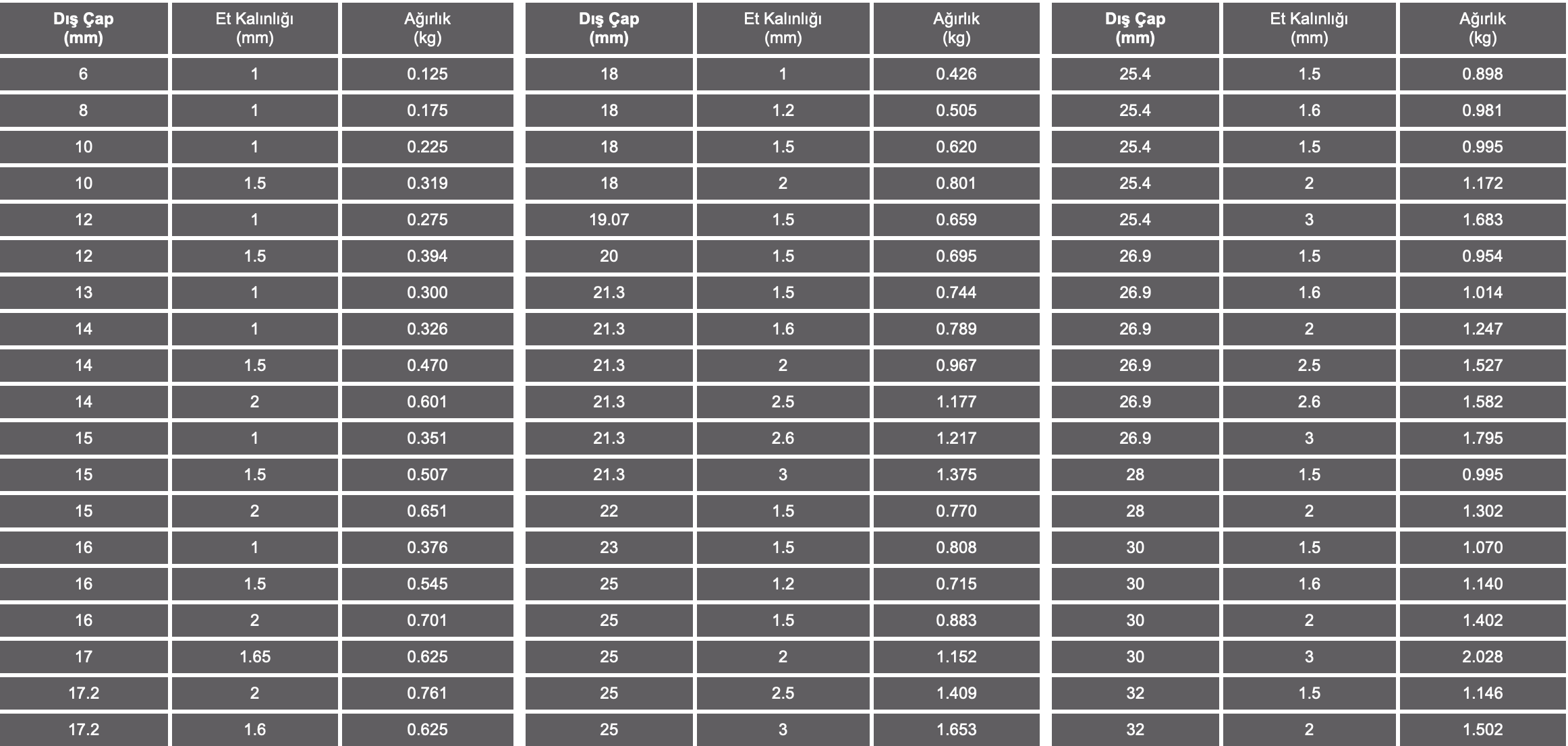 Paslanmaz Boru Ölçüleri (304 ve 316)