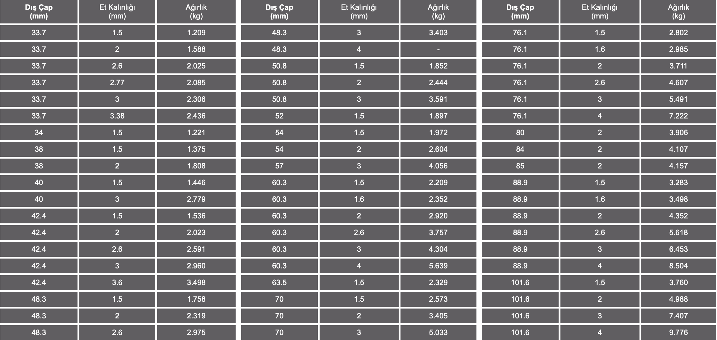 - Uygulama Alanları: Genel olarak sıvı ve gaz taşıma, inşaat ve dekoratif amaçlar için kullanılır. Dikişli borular, düşük ve orta basınç uygulamaları için uygundur.